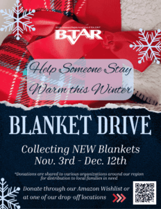 The 2025 BTVAR Blanket Drive is up and running! Share the gift of warmth by purchasing new blankets and dropping them off in one of our blanket boxes, or at the BTVAR Office, November 3rd - December 12th