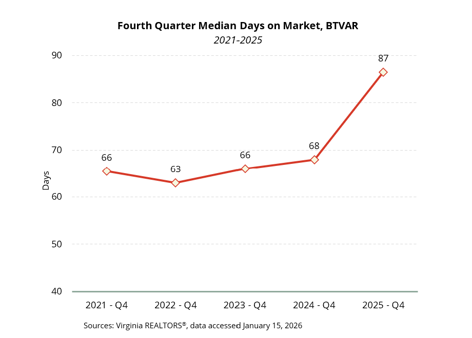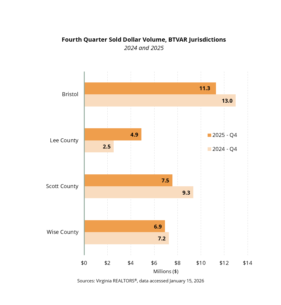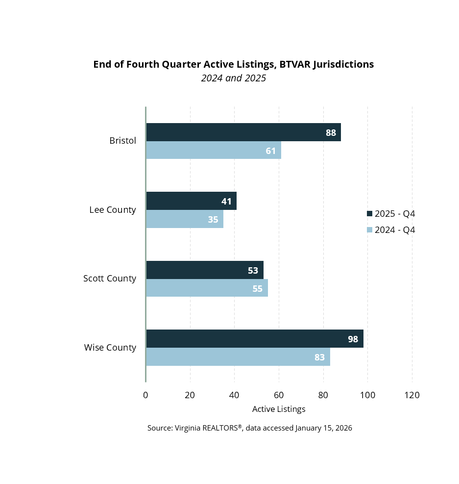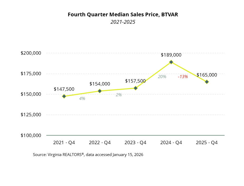 • The quarterly median price in the BTVAR footprint fell for the second time in 2025. The regionwide median price was $165,000 in the fourth quarter, about $24,000 lower than a year ago (-13%).