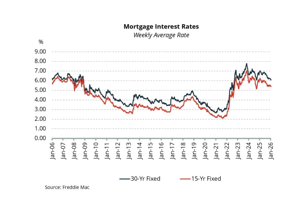 • Mortgage rates continue to drift downward. The average rate on a 30-fixed mortgage in the second week of January 2026 was 6.06%. This is the lowest it’s been since mid-September 2022.