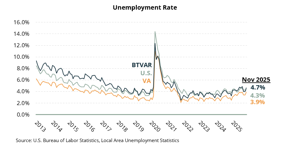 • The unemployment rate in Virginia jumped to 3.9% in November (not seasonally adjusted), up 2.9% last November. In the BTVAR footprint, the unemployment rate was 4.7%, up from 3.7% last November.