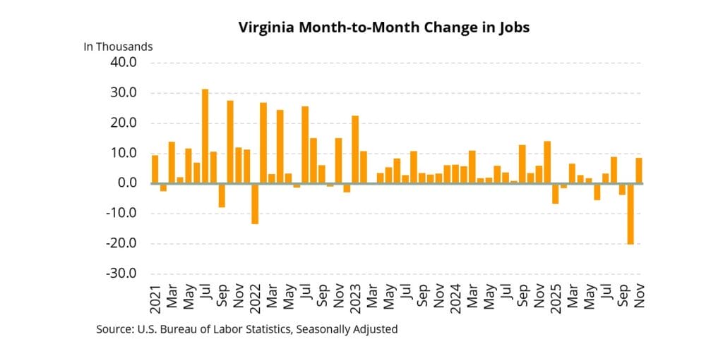 • There were approximately 4.27 million jobs in Virginia as of November 2025, this is about 8,600 more than the October 2025 totals, but down about 800 jobs from the start of 2025.